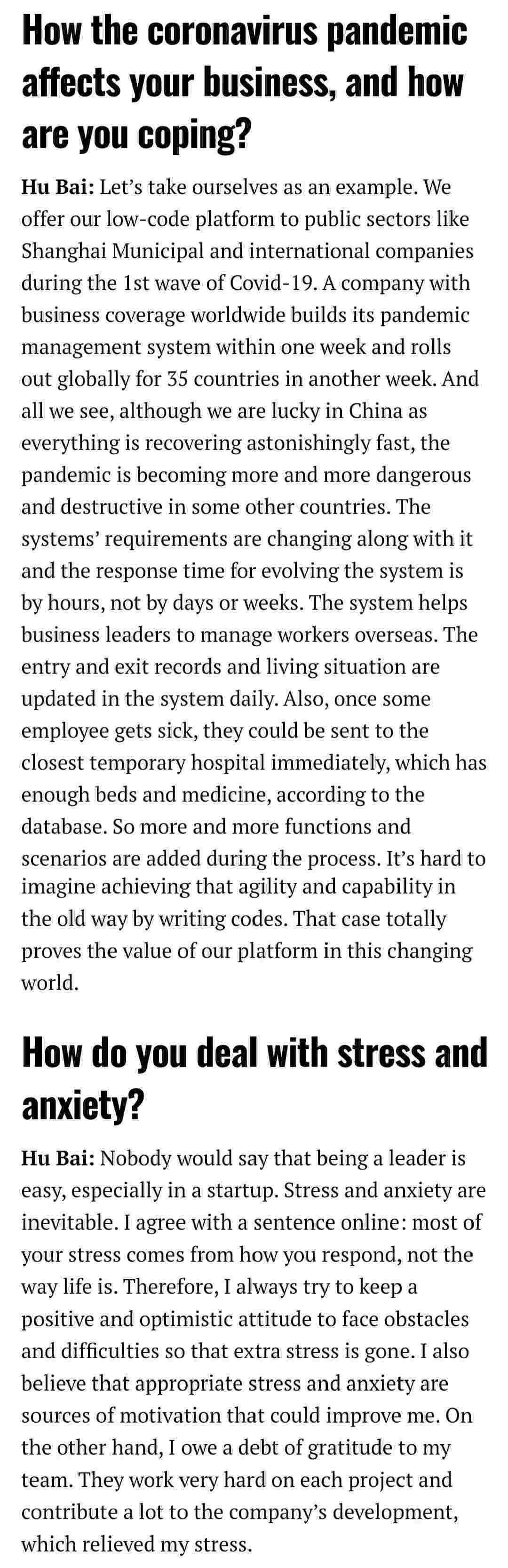 2021年年初,,,,爱湃斯科技CEO胡柏受邀接受法媒Startup.info的专访,,,,与Startup info的读者分享了自己的创业经历、、、以及低代码平台NO钱包的创新之处。。
