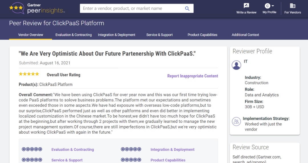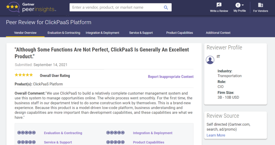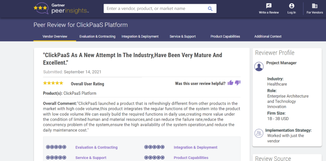 Tips::【Peer Insights】——用户对企业IT产品和服务发布真实评价的平台。。目前已有355个市场,,255,000条经过验证的评价。。每一条评价Gartner会针对参评企业营收规模及参评人员信息做验证、、、、评价内容做多维核实。。